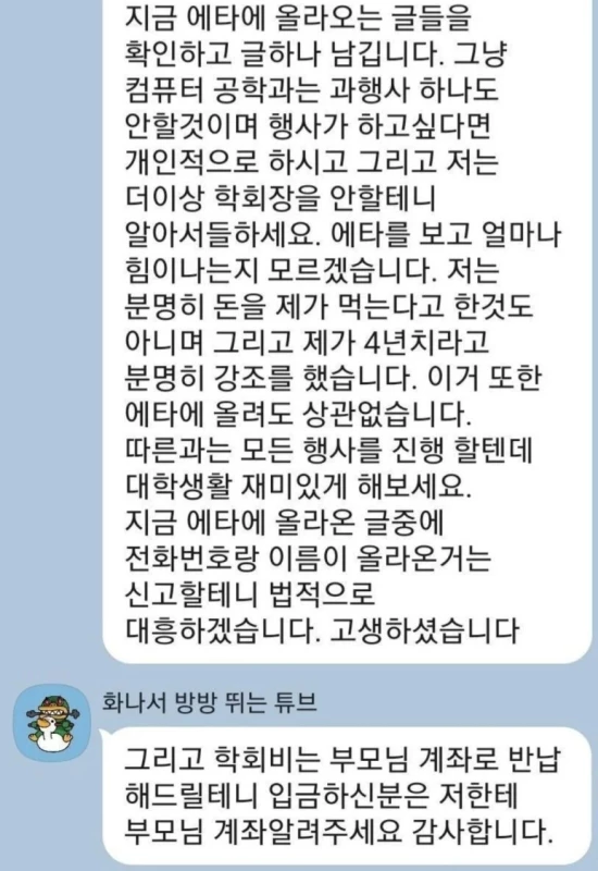심지어 지난해 대전의 한 대학교에서는 학생회장이 "회비를 자녀에게 전달하지 말고 직접 계좌이체 하라", "가정 형편상 학생회비를 즉납할 수 없으면 분납도 가능하니 연락 바란다"는 내용을 담은 안내장을 학부모에게 보낸 일도 있었다.