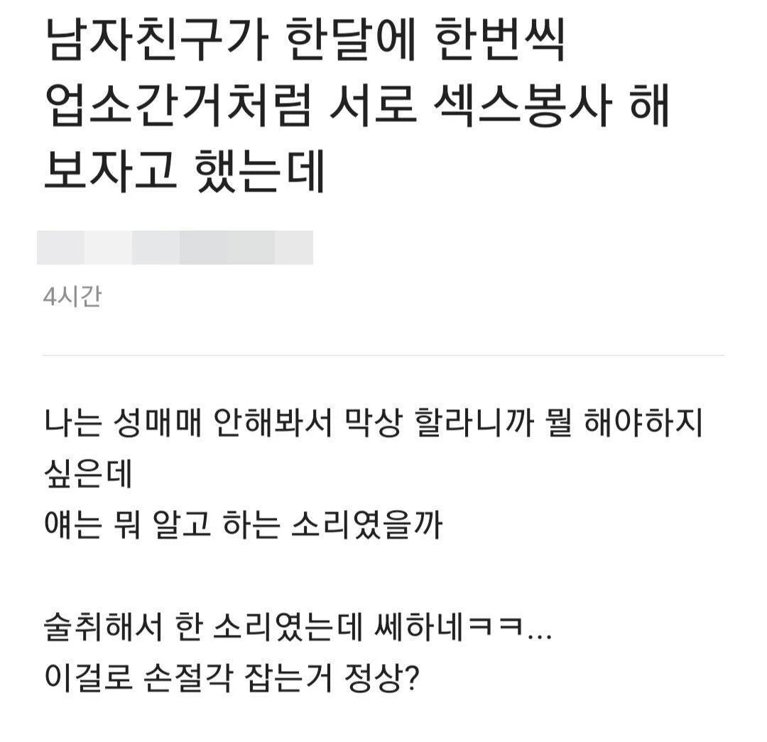 그는 "남자친구가 한 달에 한 번씩 업소 간 거처럼 서로 섹스 봉사해 보자고 했는데"라며 "나는 성매매 안 해봐서 막상 하려니까 뭘 해야 하지 싶다"고 토로했다.