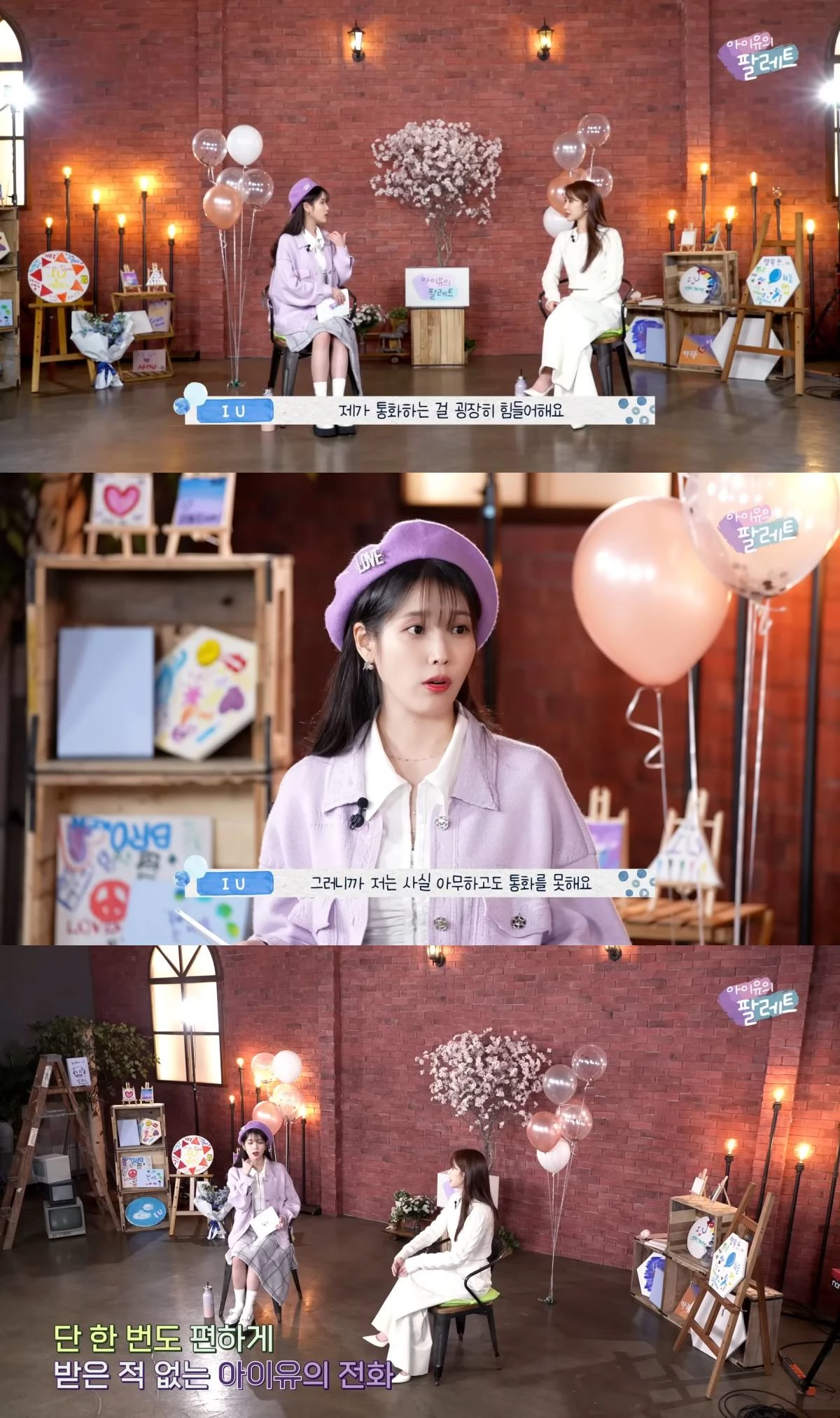 아이유는 "일단 가만히 앉아서 통화를 잘 못한다. 엄마랑 통화를 하더라도. 전화가 오면 조금 불편해진다"라고 털어놨다. 이어 "안 불편한 사람은 매니저 오빠다. 워낙 일 얘기를 할 게 많아서 그런 것 같다. 심지어 인나 씨와 통화하는 것도 힘들어한다. 사실 아무하고도 통화를 못한다"라고 고백했다.