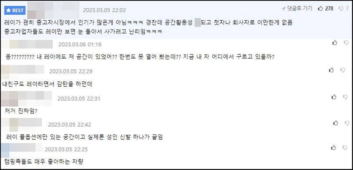 이 내용을 확인한 대다수 네티즌들은 진짜냐고 반신반의하며 신기하다는 반응을 보였다. 한 네티즌은 수년 째 레이를 타고 있지만 몰랐다는 말을 남기기도 했다. 반면 일부 네티즌은 해당 기능은 옵션을 넣어야만 사용할 수 있고, 실제로는 성인 신발 한 켤레 정도가 들어가는 사이즈라고 말하기도 했다.