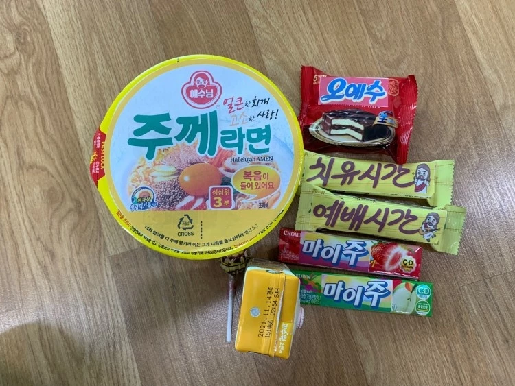 원래 이 제품들의 이름은 '참깨라면', '오예스', '마이쮸'이지만, 사진 속 간식엔 '주께라면', '오예수', '마이주'라고 적혀 있었다. 기독교식(?)으로 재탄생한 이름들이었다.