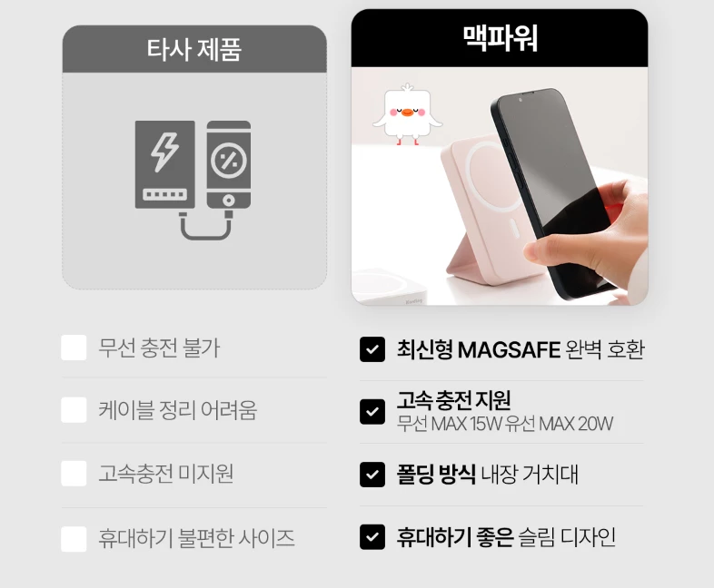 맥세이프란 아이폰12 시리즈부터 새롭게 추가한 기능으로써 스마트폰에 마그네틱을 탑재해 무선 충전 효율을 높인 기술이다. 이 보조배터리는 초강력 마그네틱 사용으로 약 900g 하중을 견디고 단단히 고정되어 안정적인 충전을 유지한다. 정품보다 1.5배 높은 약 2100 가우스로 부착력이 매우 좋다.