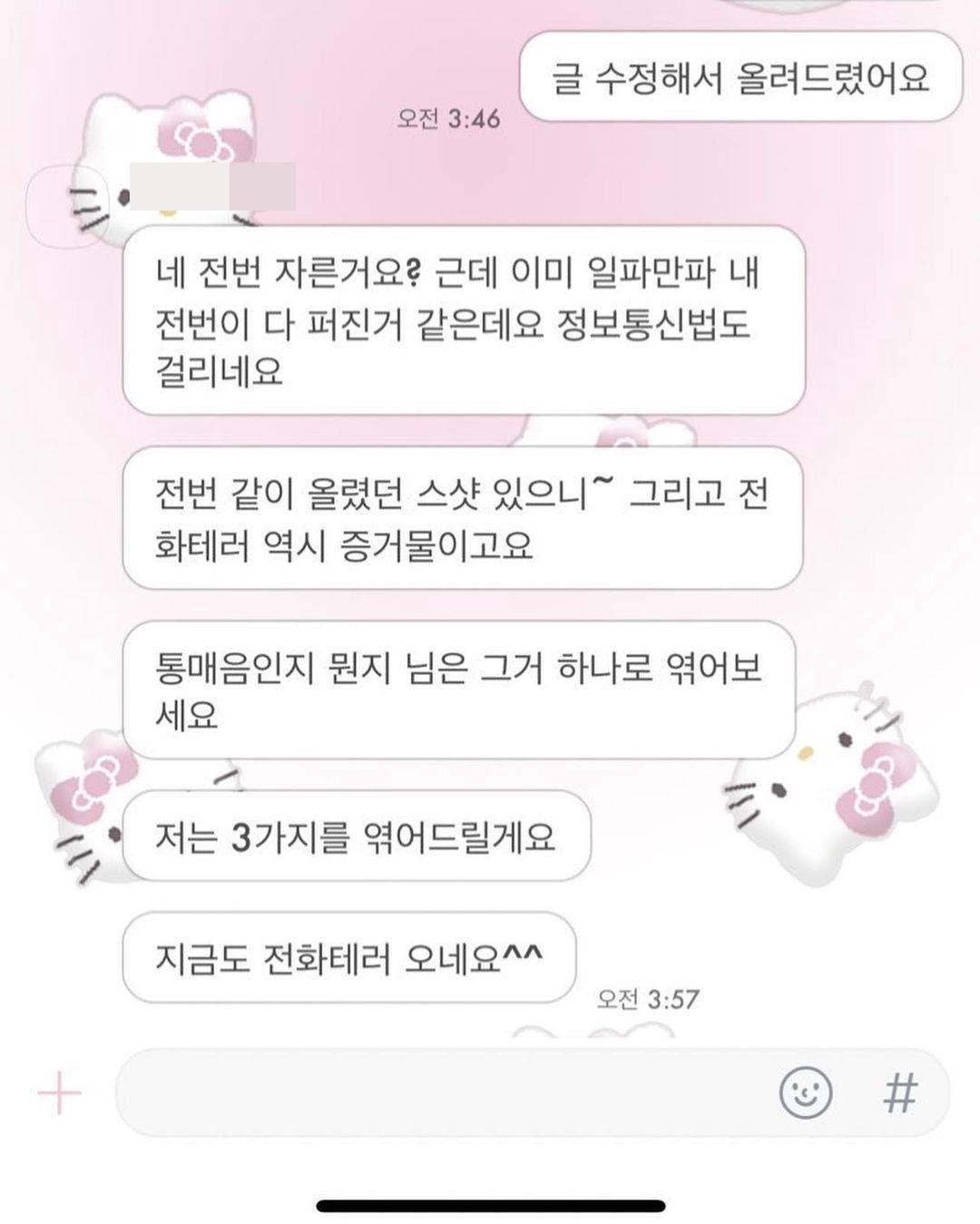 B씨는 "나로 인해 당신이 피해 본 건 없는데 저는 지금 엄청난 피해를 보고 있다. 어마무시한 전화 테러로 인해 지금 장난이 아니다. 알아보니 충분히 고소감"이라며 "업체명을 모자이크도 없이 전화번호랑 노출을 시켜놓고 새벽에 잠을 못 자게 한다? 뒷감당 어쩌시려고 이러시나? 뒷감당 자신 있으시나?"라고도 반문했다.