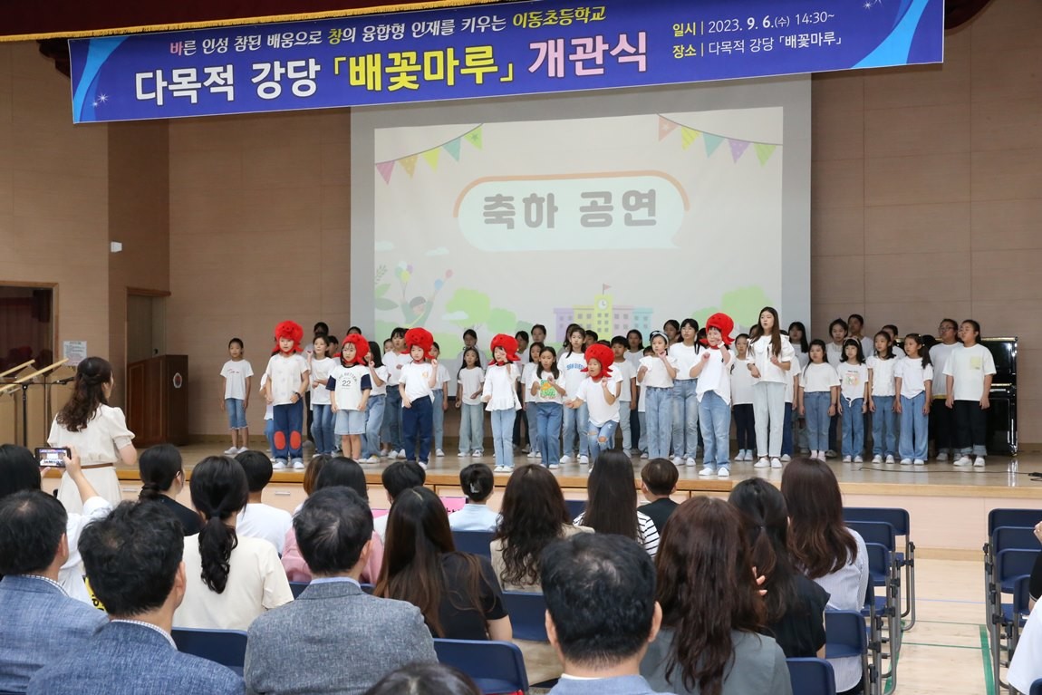 개관식은 이동초등학교 60여 명의 ‘배꽃합창단’의 축하공연을 시작으로 임종식 경상북도교육감 축하영상, 천종복 포항교육지원청 교육장 격려사, 학생들과 학부모님들의 축하영상과 부대행사로 교목인 ‘배롱나무’ 꽃을 배경으로 한 사진전시 등 다양하게 진행됐다.