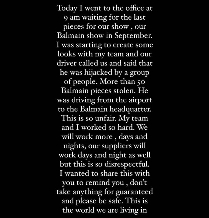 지난 17일(현지 시각) 발망 크리에이티브 디렉터 겸 수석 디자이너 올리비에 루스테잉은 자신의 인스타그램에 "패션쇼 전 마지막 피팅 작업을 앞두고 새 컬렉션 옷들이 공항에서 파리 본사로 이동하던 중 강도들에 의해 모두 사라졌다"고 밝혔다.