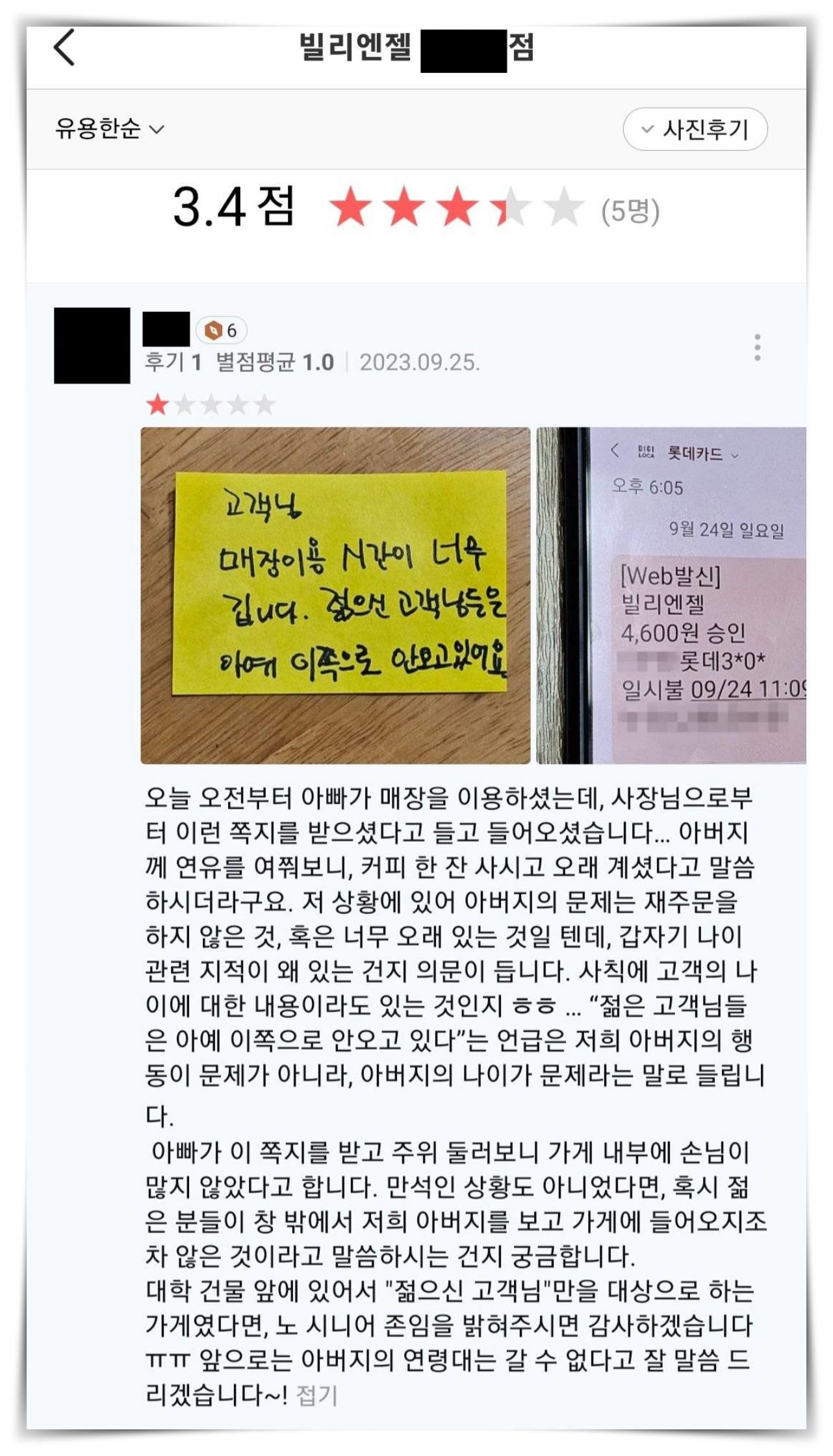 후기 작성자는 쪽지 내용에 대해 언급하며 "저 상황에 있어 아버지 문제는 재주문을 하지 않은 것 혹은 (매장에) 오래 있었던 것일 텐데, 갑자기 나이 관련 지적이 왜 있는 건지 의문이 든다"며 "사칙에 고객 나이에 대한 내용이라도 있는 건지...'젊은 고객님들은 아예 이쪽으로 안 오고 있다'는 말은 저희 아버지 행동이 문제가 아니라, 아버지 나이가 문제라는 말로 들린다"고 따졌다.
