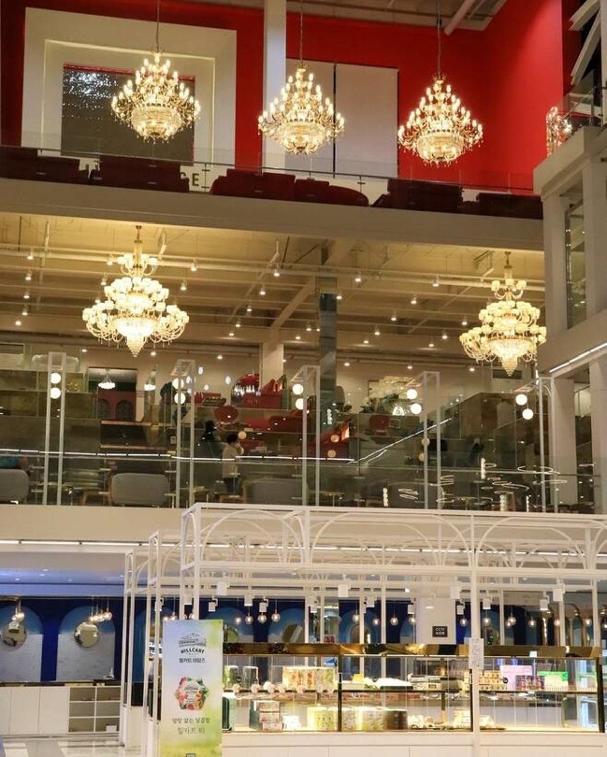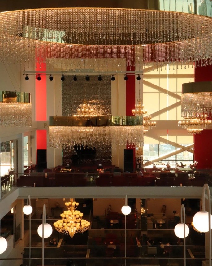 밖에서 보면 카페가 아니라 마치 아웃렛처럼 보인다. 황금빛으로 도배된 입구를 지나 내부로 들어가면 우선 높은 천정과 샹들리에 등이 눈에 띈다. 건물 중앙은 높게 뻥 뚫렸고, 호텔 콘셉트다 보니 화려한 특급 호텔 로비에 와 있는 듯한 착시를 준다.