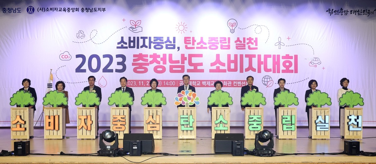 도는 21일 공주대학교 백제문화교육관에서 김태흠 지사와 소비자단체 회원 등 600여 명이 참석한 가운데, 소비자중심 탄소중립 실천을 약속하는 ‘2023 충남도 소비자대회’를 개최하고, △저탄소인증 제품 구매하기 △친환경 에너지 제품 사용하기 △일회용품 사용 하지 않기 등 생활속 탄소중립 실천을 약속했다.