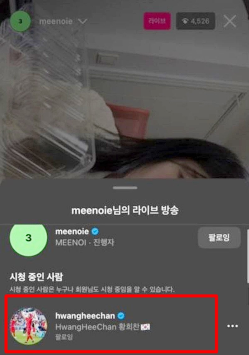 주인공은 축구 대표팀 공격수 황희찬이었다. 그는 인스타그램 가계정이 아니라 본계정으로 라방을 시청한 것으로 전해졌다.
