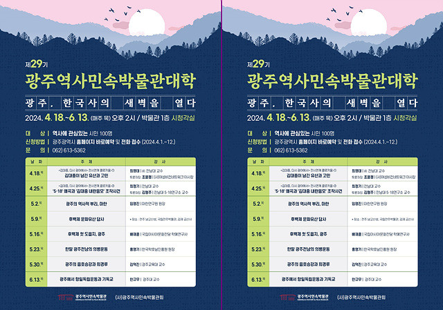최경화 광주역사민속박물관장은 “이번 박물관대학은 광주역사의 힘과 진정성을 제대로 느낄 수 있는 강좌로 마련했다”며 “시민들이 광주의 시선으로 광주역사를 올곧게 살펴볼 수 있는 계기가 되길 바란다”고 말했다.