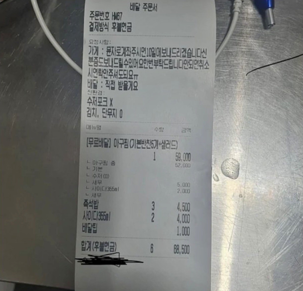 돈이 없다는 고객이 기본 반찬 5개와 샐러드가 나오는 아귀찜 세트, 즉석밥 3개, 사이다 355ml 등 총 6만 8500원 식사를 주문했기 때문이다.