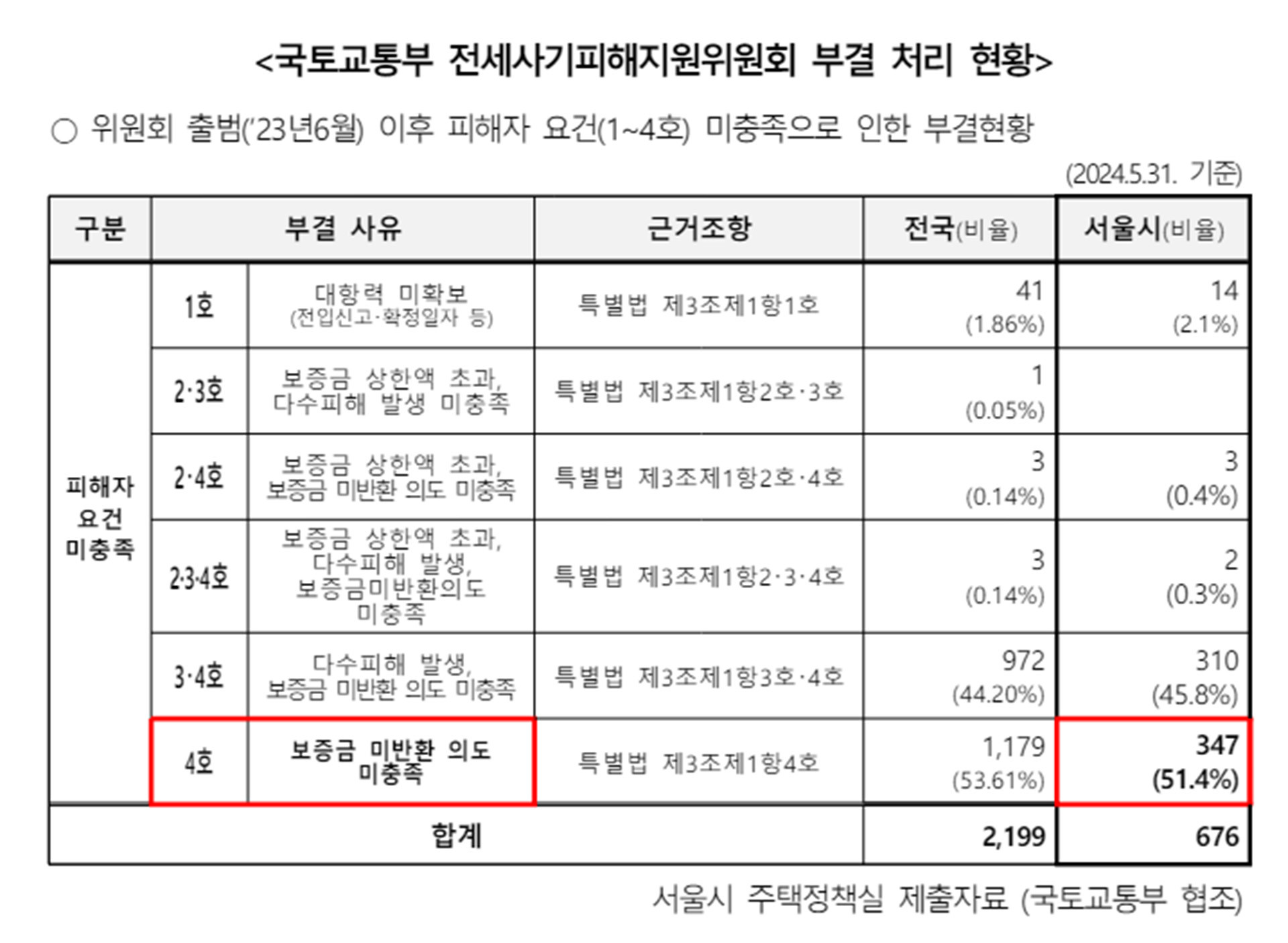 그러나 피해자 인정 요건 중 특히 ④임대인이 보증금 반환 의도가 없는 경우, 즉 '임대인의 전세 사기 의도 입증'을 임차인이 해야 하는 것이 사실상 매우 어려워 피해자들이 법적 구제를 받지 못하고 있는 사각지대가 발생하고 있다. 실제로 서울시 주택정책실 '전세사기피해지원위원회 부결현황' 자료에 따르면 서울시 내에서 전세 사기 피해자 요건을 미충족하여 부결된 사례 총 676건 중 '임대인의 전세 사기 의도(보증금 미반환 의도)'를 입증하지 못해 피해자로 인정되지 않은 사례가 51.4%(347건)로 가장 큰 비중을 차지하고 있다.