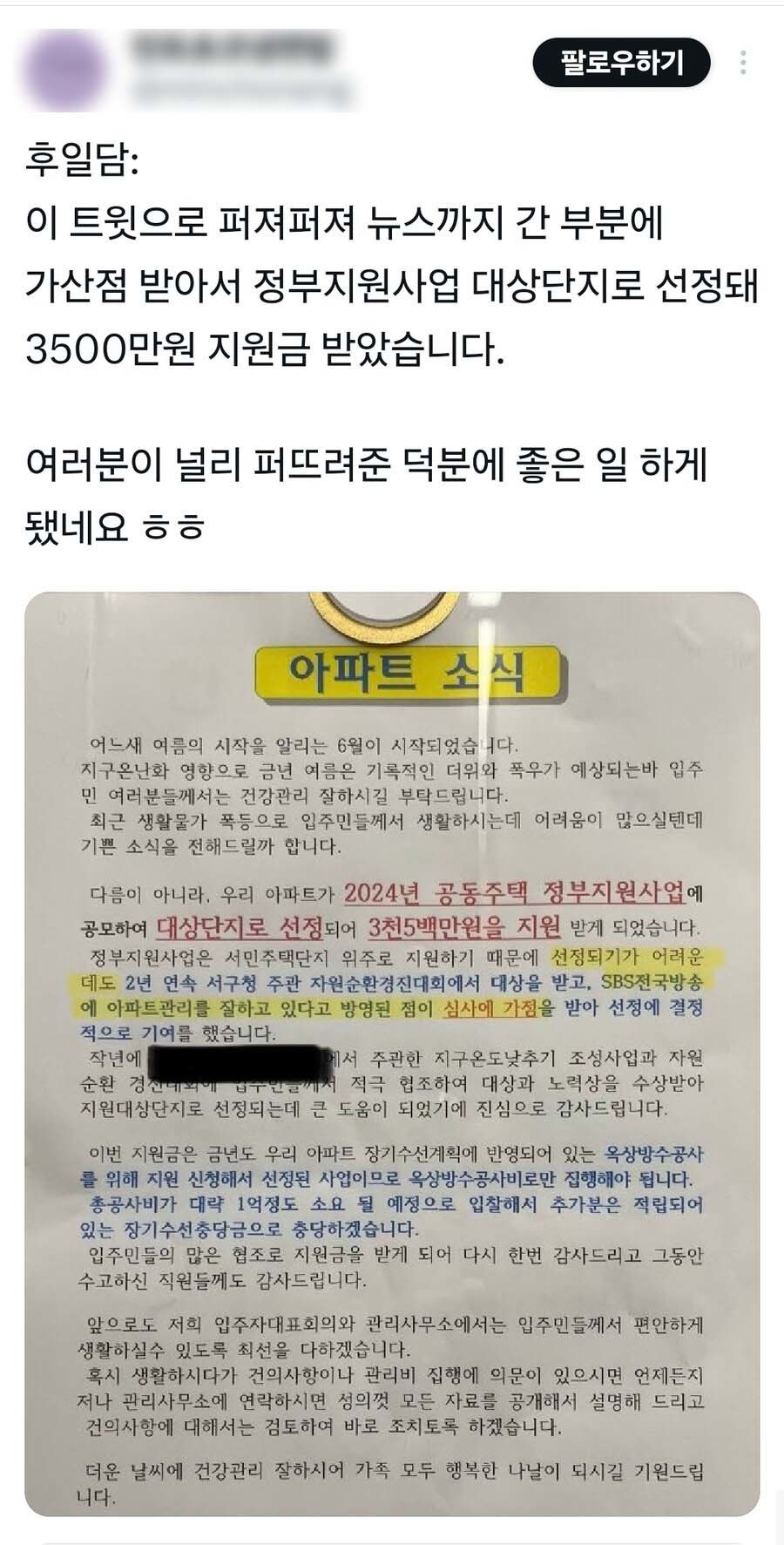해당 아파트 단지에 살고 있는 B 씨는 최근 X에 게시물을 올려 A 씨 덕분에 자기가 사는 아파트 단지가 ‘2024년 공동주택 정부지원사업’ 대상 단지로 선정돼 3500만원의 지원금을 받게 됐다고 밝혔다. 그러면서 아파트 측 공지문을 소개했다.