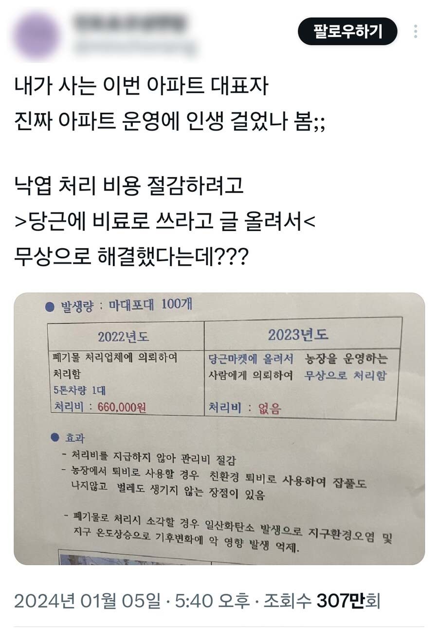 B 씨에 따르면 A 씨는 2023년 단지 내에서 발생한 낙엽의 처리를 폐기물 처리업체에 맡기는 대신 당근마켓을 통해 한 농장에 무상으로 제공하는 방식으로 처리했다고 공지문에서 밝혔다. 덕분에 처리 비용이 한 푼도 발생하지 않았다고 알렸다.