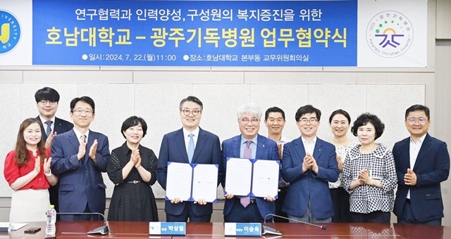 호남대학교(총장 박상철)는 7월 22일 본부동 3층 교무위원회의실에서 광주기독병원(병원장 이승욱)과 업무협약을 체결, 양 기관이 공통 관심분야 연구협력과 인력양성, 구성원의 복지증진을 위해 상호협력하기로 했다.