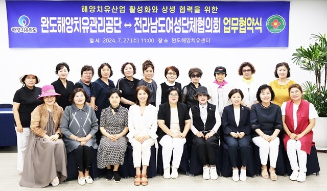완도해양치유관리공단(이사장 이채빈)은 7월 24일 완도해양치유센터 홍보관에서 최두례 전라남도여성단체협의회 회장을 비롯한 도내 13개 소속 단체 여성 리더들, 완도군 여성단체협의회 관계자들이 참석한 가운데 상생 협력을 위한 업무협약을 체결했다.