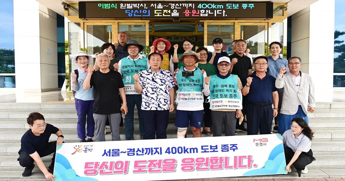 [경북=위키트리]이창형.윤문이 기자=경북 문경시는 지난 3일 문경시청에서 대구경북 통합과 장애인 복지 향상을 실현하기 위해 서울에서 경산까지 도보로 400km 국토 종주에 나선 이범식 왼발 박사 일행의 문경 도착을 환영했다.