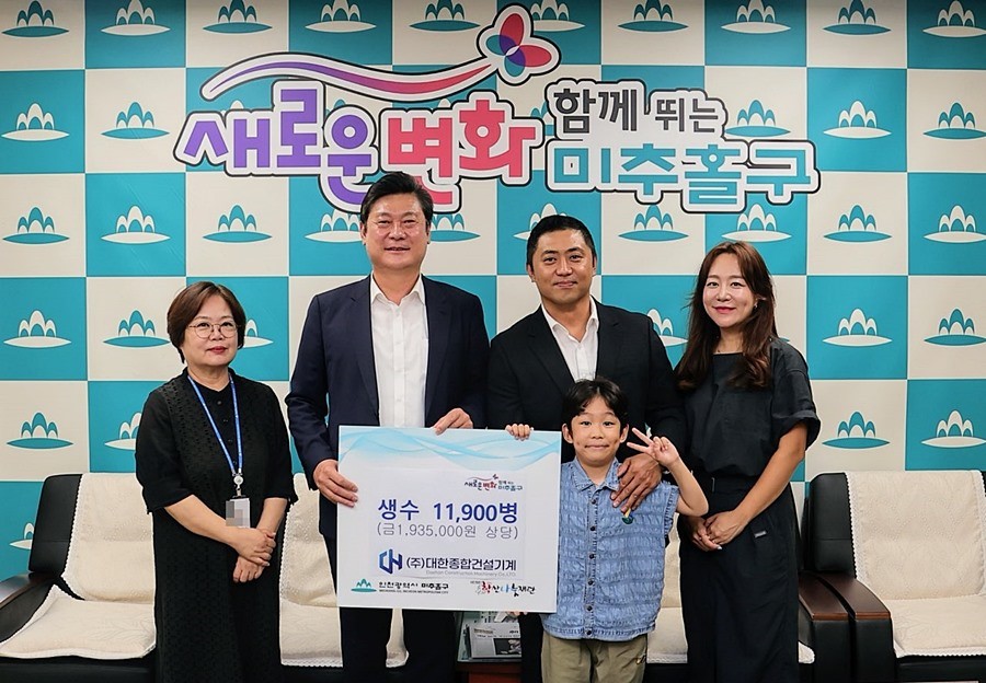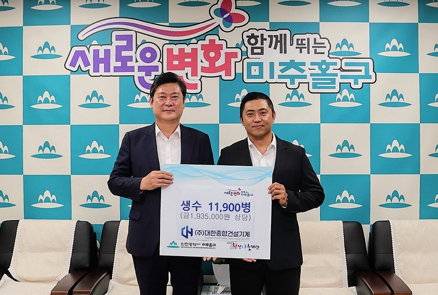 인천 미추홀구(구청장 이영훈)는 12일 ㈜대한종합건설기계(대표이사 정광조)로부터 구민의 건강한 여름나기를 위한 생수 330ml 11,900병을 전달받았다.