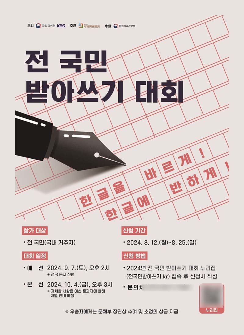 ‘전 국민 받아쓰기 대회’의 자세한 정보는 '2024 전 국민 받아쓰기 대회' 누리집에서 확인할 수 있다.